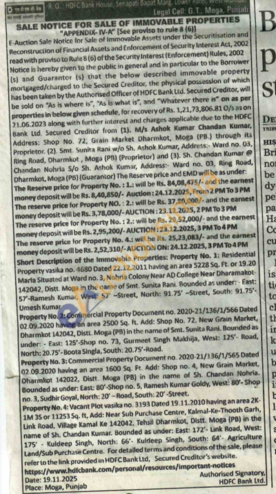 Property No. 1: Residential Property vasika no. 4680 Dated 22.12.2011 having an area 5228 Sq. Ft. or 19.20 Marla Situated at Ward no. 3, Nohria Colony Near AD College Near Dharamakot 142042, Distt. Moga in the name of Smt. Sunita Rani. Bounded as under: East: 57-Ramesh Kumar, West: 57' -Street, North: 91.75' -Street, South: 91.75 Umesh Kumar
