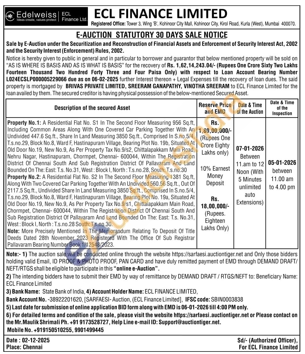 Property No.1: A Residential Flat No. S1 In The Second Floor Measuring 956 Sq.ft, Including Common Areas Along With One Covered Car Parking Together With An Undivided 447.6 Sq.ft., Share In Land Measuring 3850 Sq.ft., Comprised In S.no.5/4, T.s.no.29, Block No.8, Ward F, Hastinapuram Village, Bearing Plot No. 19b, Situated At Old Door No. 19, New No.9, As Per Property Tax No.9/s2, Chittalapakkam Main Road, Nehru Nagar, Hastinapuram, Chormpet, Chennai- 600044, Within The Registration District Of Chennai South And Sub Registration District Of Pallavaram And Land Bounded On The: East: T.s. No.31, West: Block I, North: T.s.no.28, South: T.s.no.30