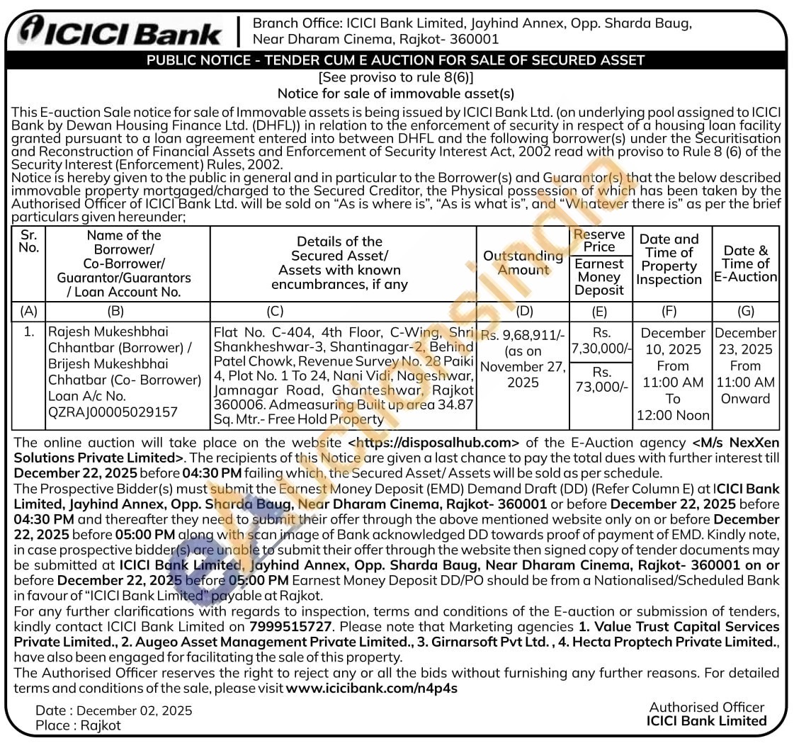 Flat No. C-404, 4th Floor, C-Wing. Shri Shankheshwar-3, Shantinagar-2, Behind Patel Chowk, Revenue Survey No. 28 Paiki 4, Plot No. 1 To 24, Nani Vidi, Nageshwar, Jamnagar Road, Ghanteshwar, Rajkot 360006. Admeasuring Built up area 34.87 Sq. Mtr.- Free Hold Property