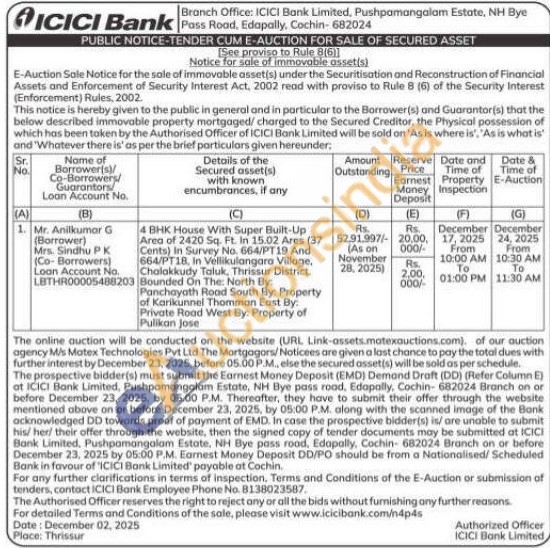 4 BHK House With Super Built-Up Area of 2420 Sq. Ft. In 15.02 Ares (37 Cents) in Survey No. 664/PT19 And 664/PT18, in Vellikulangara Village, Chalakkudy Taluk, Thrissur District. Bounded On The North By: Panchayath Road South By: Property of Karikunnel Thomman East By: Private Road West By: Property of Pulikan Jose