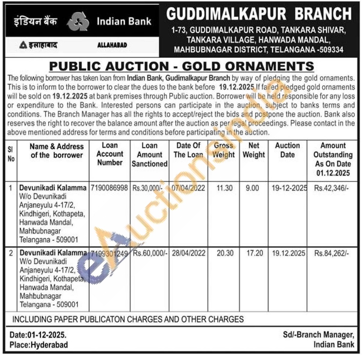 Indian Bank Gold Auctions Auction in Mahabubnagar