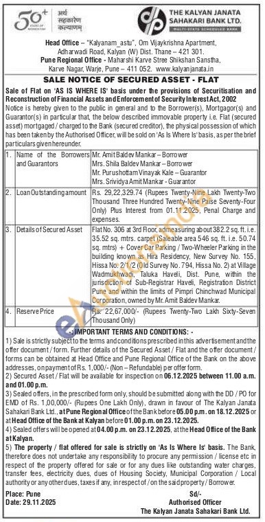 Flat No. 306 at 3rd Floor, admeasuring about 382.2 sq. ft. i.e. 35.52 sq. mtrs, carpet (Saleable area 546 sq. ft. i.e. 50.74 sq. mtrs) + Cover Car Parking/Two-Wheeler Parking in the building known as Hira Residency, New Survey No. 155, Hissa No. 2/1/2 (Old Survey No. 794, Hissa No. 2) at Village Wadmukhwadi, Taluka Haveli, Dist. Pune, within the jurisdiction of Sub-Registrar Haveli, Registration District Pune and within the limits of Pimpri Chinchwad Municipal Corporation, owned by Mr. Amit Baldev Mankar