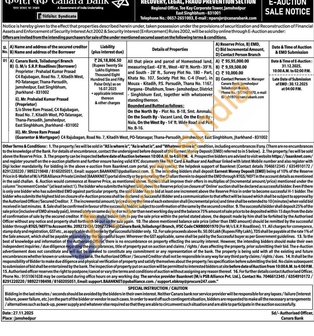 All that piece and parcel of Homestead land, measuring East-43'ft., West-40'ft. North-39' ft. and South28' ft., Survey Plot No. 180 Part, Khata No. 107, Society Plot No. C-4 (Four), in Mouza Kitadih, P.S. Parsudih, Thana No. 1167, Pargana-Dhalbhum, Town-Jamshedpur, District Singhbhum East, together with whatsoever standing thereon.