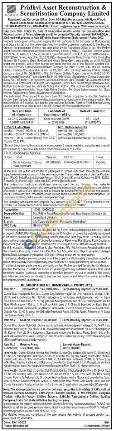 Item No.3a-Guntur District, Guntur Sub District, Guntur City, Lalapet Old Ward 10, Block No.3 T.S.No.377 building with Door No 22-12-88, an extent of 150 Sq. Yds, having construction of RCC building with Ground Floor Plinth area of 1400 sq. ft, First Floor Plinth area of 1400 sq. ft, belonging to Sri. Gopu Krishna Raghavendra Gupta and bounded by. East Road, South Kanigalpula Venkata Narasimharao, West: Kanigalpula Venkata Narasimha Rao, North: K. Hanumantha rao