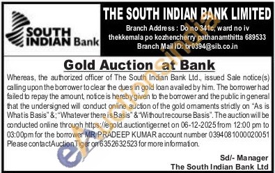 South Indian Bank Gold Auctions Auction in Pathanamthitta