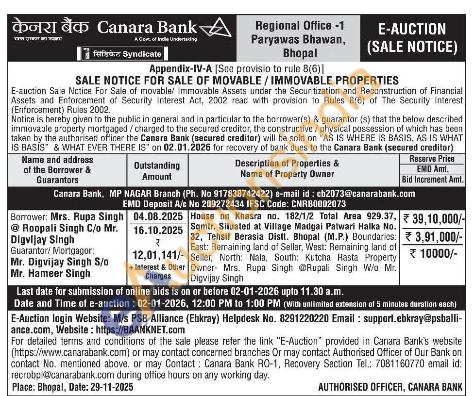 House on Khasra no. 182/1/2 Total Area 929.37, Sqmtr. Situated at Village Madgai Patwari Halka No. 32, Tehsil Berasia Distt. Bhopal (M.P.)