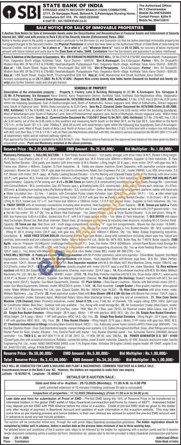 Authorised Officer Mr.Y.Chandrasekar Mobile No : 9487626069 / Contact Person: Ajitha R Mobile No : 9944153819