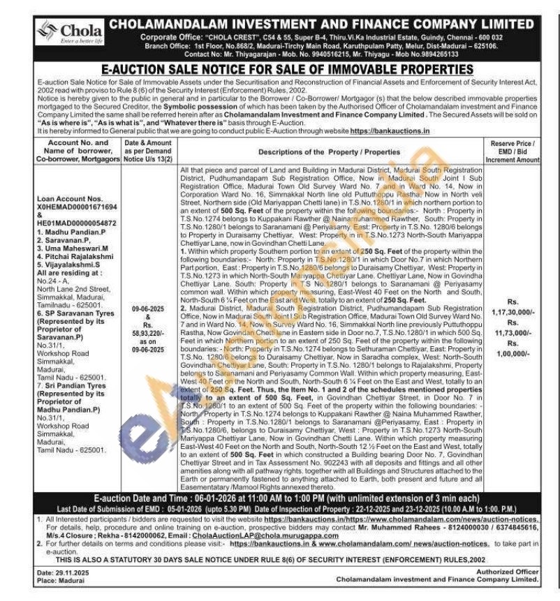 All that piece and parcel of Land and Building in Madurai District, Madurai South Registration District, Pudhumandapam Sub Registration Office, Now in Madurai South Joint Sub Registration Office, Madurai Town Old Survey Ward No. 7 and in Ward No. 14, Now in Corporation Ward No. 16, Simmakkal North line old Puttuthoppu Rastha. Now in North veli Street, Northern side (Old Mariyappan Chetti lane) in T.S.No. 1280/1 in which northem portion to an extent of 500 Sq. Feet of the property within the following boundaries: North: Property in T.S. No. 1274 belongs to Kuppakani Rawther @ Nainamuhammed Rawther, South, Property in T.S.No. 1280/1 belongs to Saranamani @ Periyasamy, East: Property in T.S.No. 1280/6 belongs to Property in Duraisamy Chettiyar, West: Property in in T.S.No. 1273 North-South Mariyappa Chettiyar Lane, now in Govindhan Chetti Lane. 1. Within which property Southern portion to an extent of 250 Sq. Feet of the property within the following boundaries: North: Property in T.S.No. 1280/1 in which Door No.7 in which Northern Part portion, East: Property in T.S.No. 1280/6 belongs to Duraisamy Chettiyar, West: Property in T.S.No. 1273 in which North-South Mariyappa Chettiyar Lane. Chettiyar Lane, Now in Govindha Chettiyar Lane. South: Property in T.S No. 1280/1 belongs to Saranamani common wall. Within which property measuring, East-West 40 Feet on the North and South, North-South 6% Feet on the East and West, totally to an extent of 250 Sq. Feet. 2. Madurai District, Madurai South Registration District, Pudhumandapam Sub Registration Office, Now in Madurai South Joint I Sub Registration Office, Madurai Town Old Survey Ward No. 7 and in Ward No. 14, Now in Survey Ward No. 16, Simmakkal North line previously Puttuthoppu Rastha, Now Govindan Chetti lane in Eastem side in Door no.7, T.S.No. 1280/1 in which 500 Sq. Feet in which Northern portion to an extent of 250 Sq. Feet of the property within the following boundaries:-North: Property in T.S.No. 1274 belongs to Sethuraman Chettiyar, East: Property in T.S.No. 1280/6 belongs to Duraisamy Chettiyar, Now in Saradha complex, West: North-South Govindhan Chettiyar Lane, South. Property in T.S.No. 1280/1 belongs to Rajalakshmi, Property belongs to Saranamani and Periyasamy Common Wall. Within which property measuring, East-West 40 Feet on the North and South, North-South 6% Feet on the East and West, totally to an extent of 250 Sq. Feet. Thus, the Item No. 1 and 2 of the schedules mentioned properties totally to an extent of 500 Sq. Feet, in Govindhan Chettiyar Street, in Door No. 7 in T.S.No. 1280/1 to an extent of 500 Sq. Feet of the property within the following boundaries: North: Property in T.S. No 1274 belongs to Kuppakani Rawther @ Naina Muhammed Rawther, South Property in T.S.No. 1280/1 belongs to Saranamani @Penyasamy. East Property in T.S.No. 1280/6, belongs to Duraisamy Chettiyar, West: Property in TS.No. 1273 North-South Mariyappa Chettiyar Lane, Now in Govindhan Chetti Lane. Within which property measuring East-West 40 Feet on the North and South, North-South 12% Feet on the East and West, totally to an extent of 500 Sq. Feet in which constructed a Building bearing Door No. 7, Govindhan Chettiyar Street and in Tax Assessment No. 902243 with all deposits and fittings and all other amenities along with all pathway rights, together with all Buildings and Structures attached to the Earth or permanently fastened to anything attached to Earth, both present and future and all Easementatary/Mamool Rights annexed thereto.