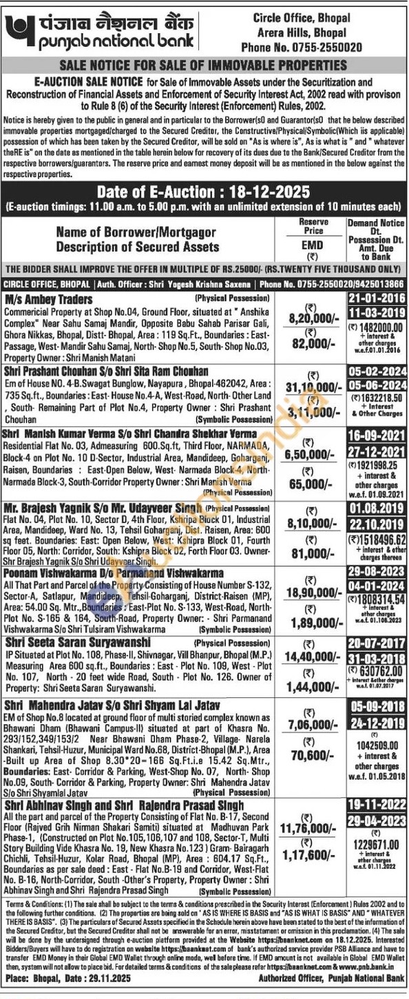 Flat No. 04, Plot No. 10, Sector D, 4th Floor, Kshripa Block 01, Industrial Area, Mandideep, Ward No. 13, Tehsil Goharganj, Dist. Raisen, Area: 600 sq feet. Boundaries: East: Open Below, West: Kshipra Block 01, Fourth Floor 05, North: Corridor, South: Kshipra Block 02, Forth Floor 03. Owner-Shr Brajesh Yagnik S/o Shri Udayveer Singh,