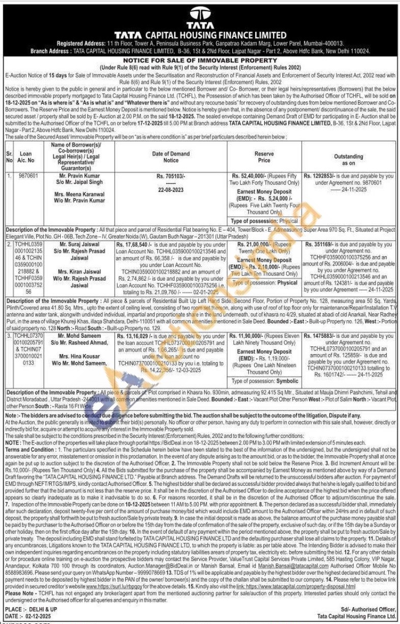 Description of the Immovable Property: All piece & parcels of: Plot comprised in Khasra No. 930min, admeasuring 92.415 Sq Mtr., Situated at Mauja Dhimri Pashchimi, Tehsil and District Moradabad, Uttar Pradesh-244001 with all common amenities mentioned in Sale Deed. Bounded:- East:- Vacant Plot Other Person West:-Plot of Salim North: Vacant Plot other Person South: Rasta 16 Ft Wide