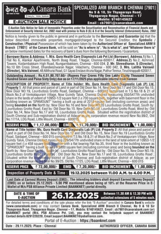 DESCRIPTION OF PROPERTY: Name of Title holder: Ms. Qura Health Care Diagnostic Lab (P) Ltd. Property 1: All that piece and parcel of Land in part of Old Door No. 14, New Door No.17 and Old Door No. 15, New Door NO.19, Lourdudoss Grotto Road, Saidapet, Chennai-600015 comprised in TS No.18 & 21 of Block No.2 of Venkatapuram Village, Now Guindy Taluk, Chennai District measuring 350/5477th undivided share in the lands of extent of 10953-1/2 square feet (1.e 700 square feet), together with basement floor in the building known as "SPAMOUNT having a built up area of 2215 square feet (including cornmon areas) and being bounded on the North by: New Door No. 16 and New Door NO.20 Lourdudoss Grotto Road, South by: Lourdudoss Grotto Road, East by: Old Door No. 15. New Door NO. 19, Lourdudass Grotto Road, West by: Old Door No.14, New Door No.17 and 18, Lourdudoss Grotto Road. Situated within the registration district of South Chennai and Sub-registration district of Adayar as per corporation revenue record New No.99/2, Old No.17/1A, LDG Road, Little Mount, Chennai-600015.