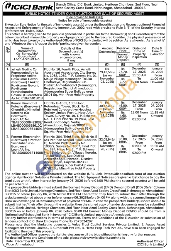 Flat No. B-1003, 10th Floor, Ratnadeep Tower, Block No. B. Rajnikunj Co-operative Housing Society Limited Part-1, Near Arjun Tower, Survey No. 19, T. P. Scheme No. 1, Final Plot No. 19 Paiki, Sola Road, Ghatlodiya, Vadaj. Ahmedabad, Gujarat-380013. Admeasuring Built-up area 83.61 Sq. Mtr.-Free Hold Property