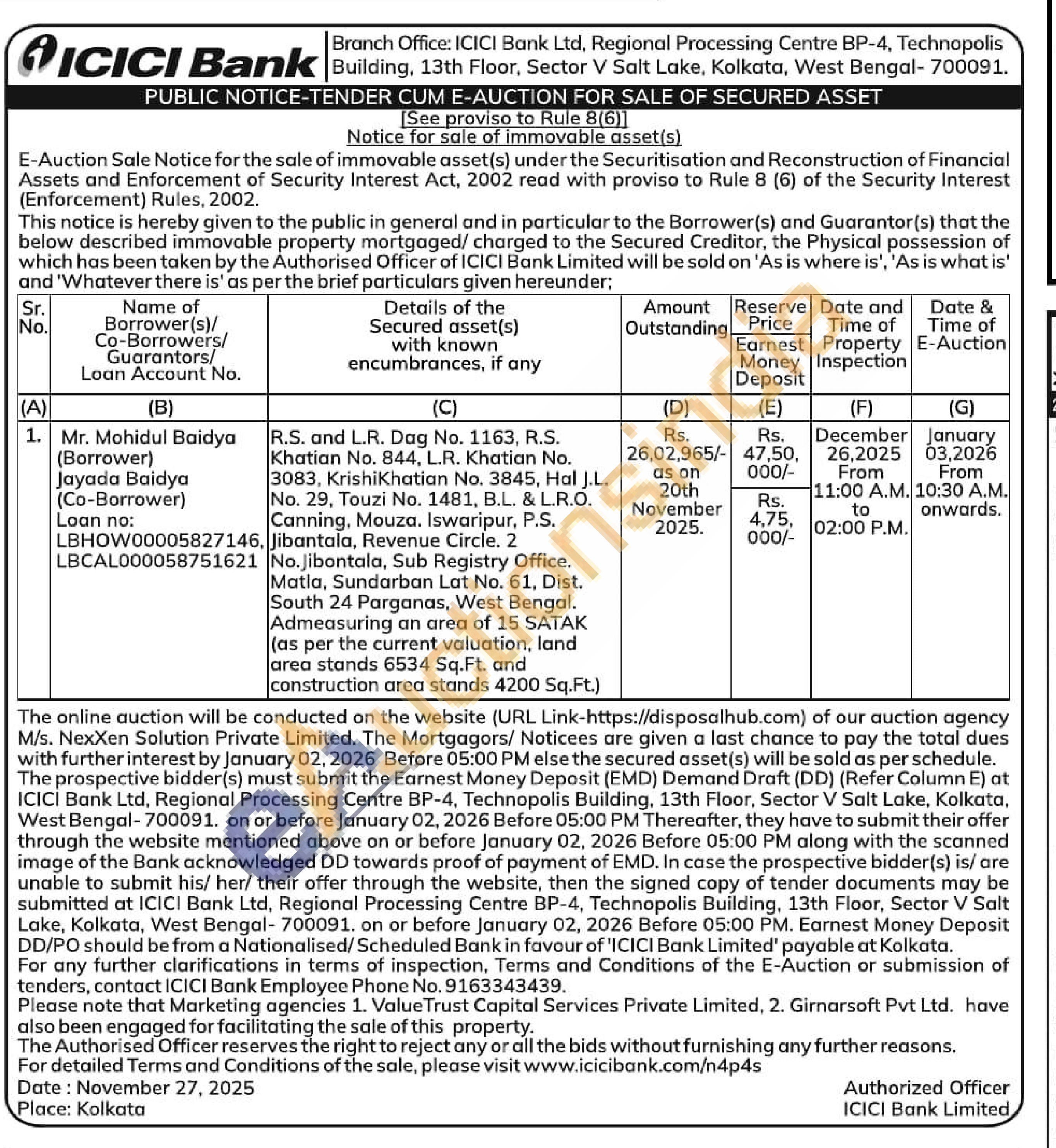 R.S. and L.R. Dag No. 1163, R.S. Khatian No. 844, L.R. Khatian No. 3083, KrishiKhatian No. 3845, Hal J.L. Canning, Mouza. Iswaripur, P.S. No. 29, Touzi No. 1481, B.L. & L.R.O. Jibantala, Revenue Circle. 2 No.Jibontala, Sub Registry Office. Matla, Sundarban Lat No. 61, Dist. South 24 Parganas, West Bengal. Admeasuring an area of 15 SATAK (as per the current valuation, land area stands 6534 Sq.Ft. and construction area stands 4200 Sq.Ft.)