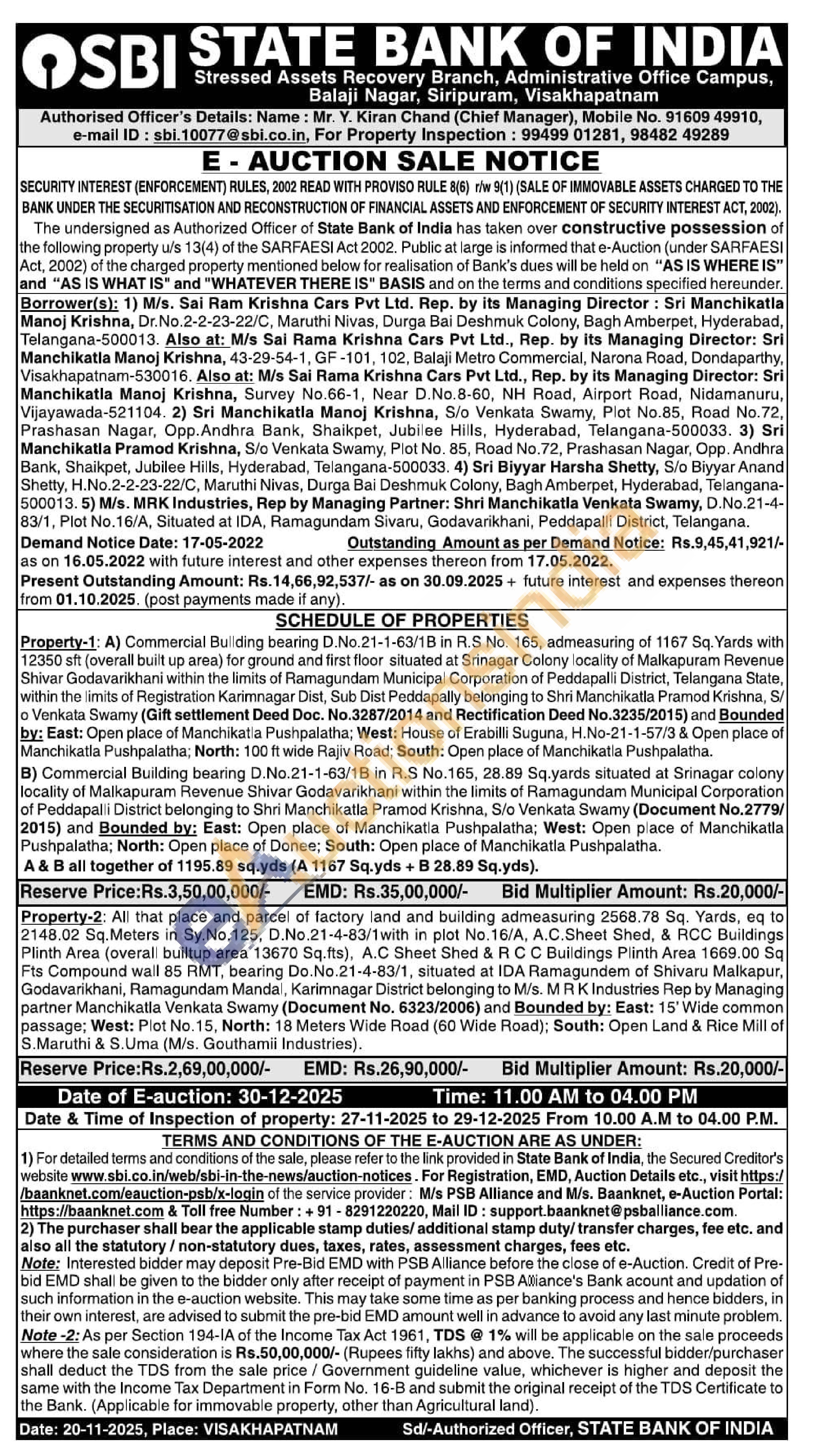 Contact Authorised Officer's Details: Name: Mr. Y. Kiran Chand (Chief Manager), Mobile No. 91609 49910