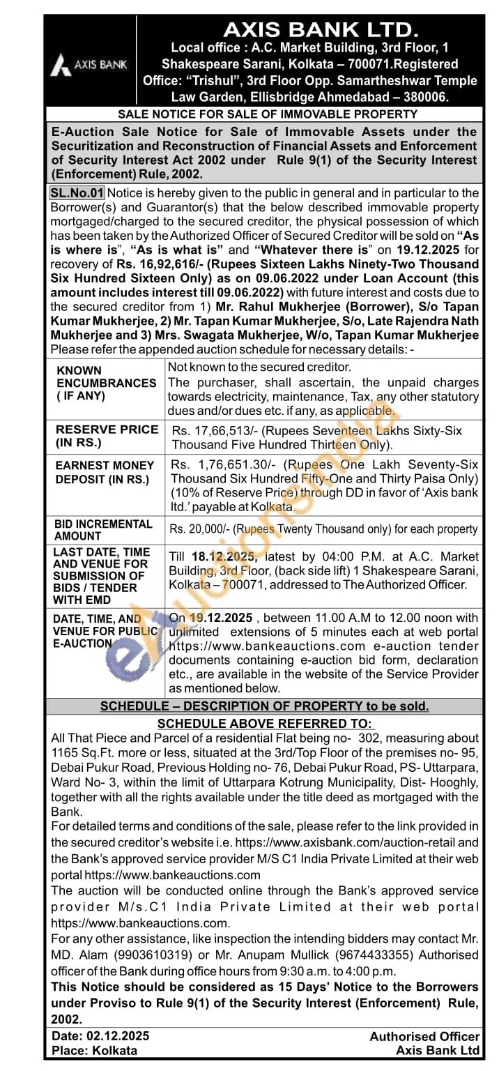 All That Piece and Parcel of a residential Flat being no- 302, measuring about 1165 Sq.Ft. more or less, situated at the 3rd/Top Floor of the premises no-95, Debai Pukur Road, Previous Holding no-76, Debai Pukur Road, PS- Uttarparга, Ward No-3, within the limit of Uttarpara Kotrung Municipality, Dist- Hooghly, together with all the rights available under the title deed as mortgaged with the Bank.