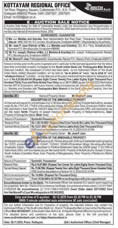 All that part and parcel of Land admeasuring 50,78. Ares along with 3400 sq.ft residential building bearing No. 12/222, situated under Sy No. 132/4A1, 132/4A2, 132:48 of Enanalloor Village, Muvattupuzha Tauk, Ernakulam District, mare fully described in Partition/Settlement Deed No.359/99 dated 11.03.1999 of Kalloorkadu SRO with boundaries (as per title deed) North Property of Muttathukuzhy Ouseph Chacko, South: Anikadu Enanalloor Road, East: Property of Mangalassery, West Property of Malekuzhy Matha Lukose