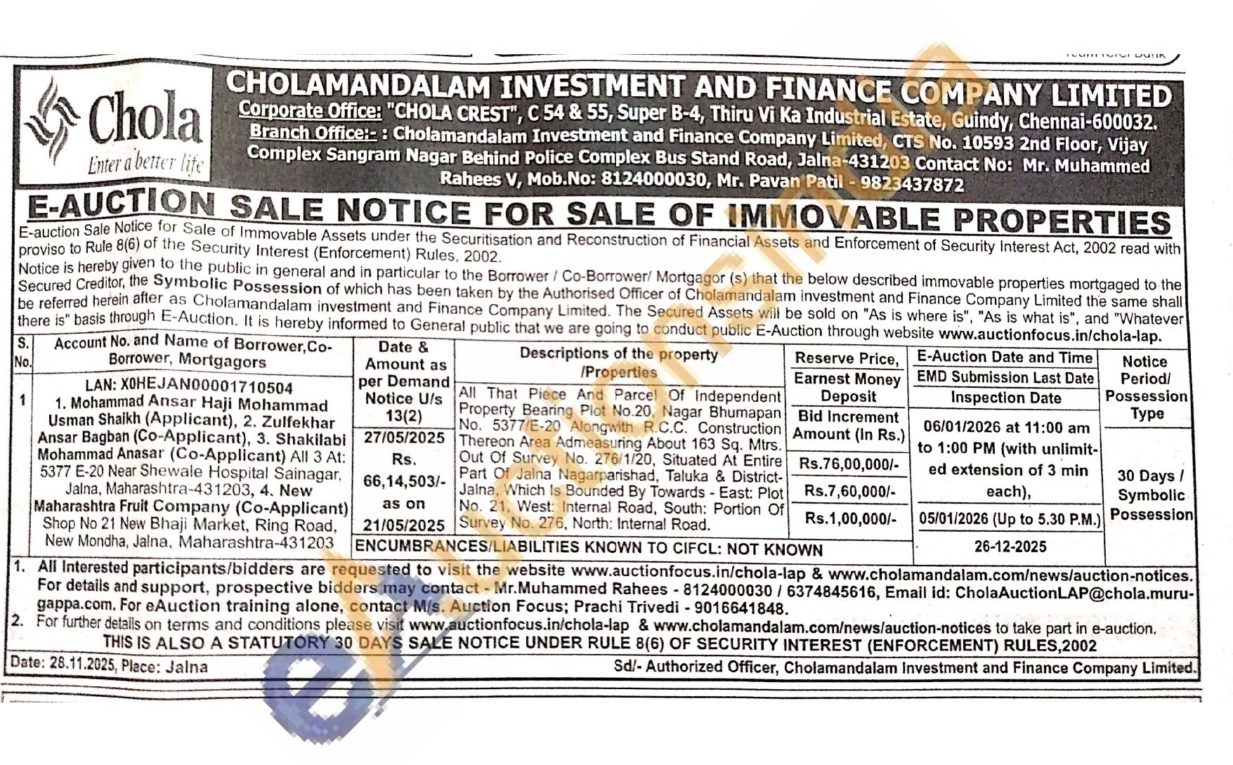 All That Piece And Parcel Of Independent Property Bearing Plot No.20, Nagar Bhumapan Thereon Area Admeasuring About 163 Sq. Mtrs. No. 5377/E-20 Alongwith R.C.C. Construction Out Of Survey No. 276/1/20, Situated At Entire Part Of Jalna Nagarparishad, Taluka & District-Jalna, Which Is Bounded By Towards - East: Plot No. 21, West: Internal Road, South: Portion Of Survey No. 276, North: Internal Road