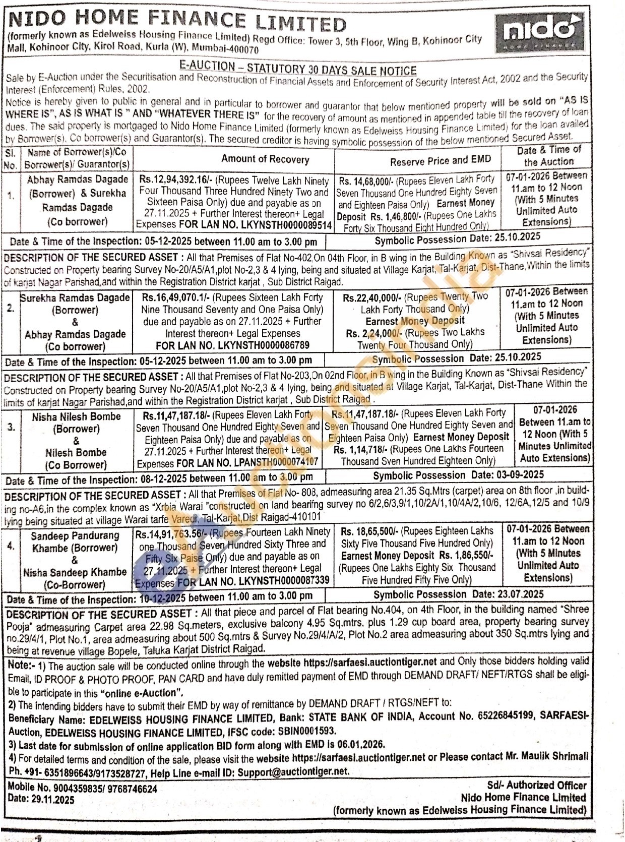 DESCRIPTION OF THE SECURED ASSET: All that piece and parcel of Flat bearing No.404, on 4th Floor, in the building named "Shree Pooja" admeasuring Carpet area 22.98 Sq.meters, exclusive balcony 4.95 Sq.mtrs, plus 1.29 cup board area, property bearing survey no.29/4/1, Plot No.1, area admeasuring about 500 Sq.mtrs & Survey No.29/4/A/2, Plot No.2 area admeasuring about 350 Sq.mtrs lying and being at revenue village Bopele, Taluka Karjat District Raigad.