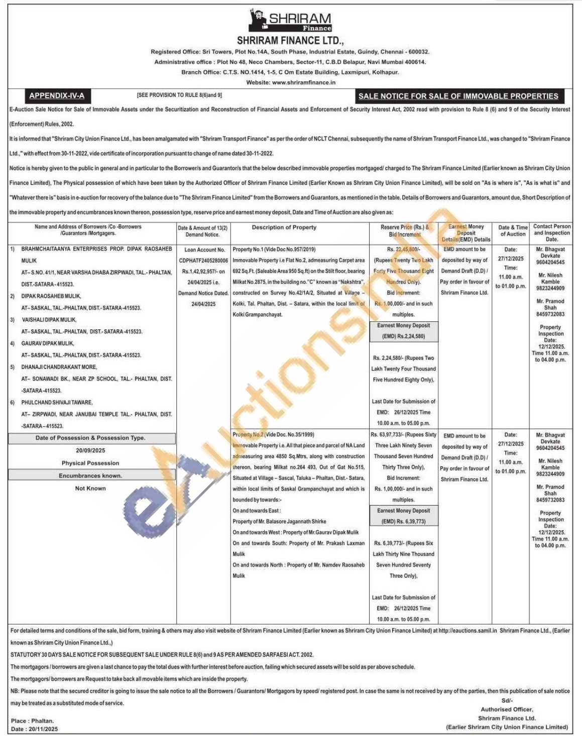 Immovable Property ie Flat No.2, admeasuring Carpet area 192 Sq Ft. (Saleable Arsa 950 50 ft) on the Stilt floor, bearing Milkat No.2875, in the building no. "C" known as "Nakshtra", constructed on Survey No.42/14/2, Situated at Village Kolki, Tel. Phaltan, Dist-Satara, within the local limit of Kolki Grampanchayat