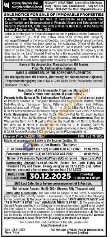 All that piece and parcel of Property situated in Thanjavur Revenue and Registration District, Vallam Sub-Registry, Thanjavur Taluk, Pillaiyarpatti Vattam and Village, Melavasthachavadi Village, Plot No.11 in 3423.75Sq.Ft=318.07Sq.mts= 0.03.19 Acres vacant site in Bharathi Nagar formed over S.No.209/2-2 Acres 50 Cents. Boundaries: North by-Plot No.27. West by-Plot No.12, South by-East West Veethi, East by-Nanjikottai Village Boundary. Measurements: East to West on the North 475 ft East to West on the South 62 ft North to South on the West 61 ft North to South on the East 631 ft Totalling 3423.75 Sq Ft-318.07Sq.mts Vacant Site. This property now lying in New S.No.209/25-0.03.19 Acres in Patta No.2428 and lying within Pillaiyarpatti limit.