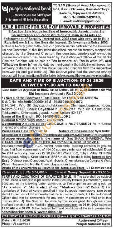 Equitable Mortgage of RCC roofed Residential building consists in ground floor, first floor admeasuring of 104.00 square yards located at Muncipal Doo No.2/41 in survey numbers 22,23,24,36/1 Ward no.2, Tekya Mitta, CHINNA Padugupadu Village, Kovur Mandal, SPSR Nellore District is being bounded by: East: D Varaprasad Compound Wall, South: Chennakesavulu Compund Wall, West: Rajaveedhi, North: Shaik Gayazuddin Land.