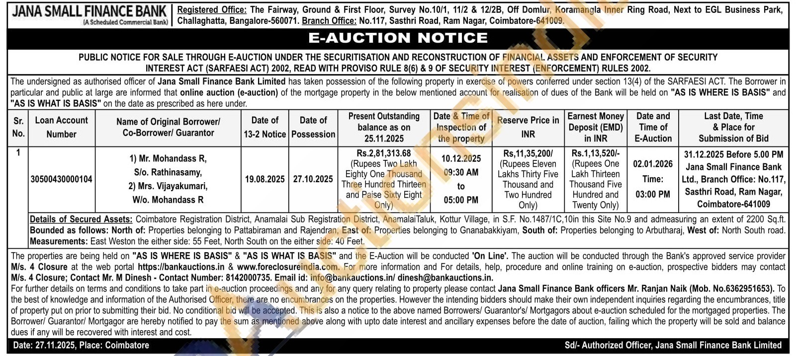 Details of Secured Assets: Coimbatore Registration District, Anamalai Sub Registration District, AnamalaiTaluk, Kottur Village, in S.F. No.1487/1C, 10in this Site No.9 and admeasuring an extent of 2200 Sq.ft. Bounded as follows: North of: Properties belonging to Pattabiraman and Rajendran, East of: Properties belonging to Gnanabakkiyam, South of: Properties belonging to Arbutharaj, West of: North South road. Measurements: East Weston the either side: 55 Feet, North South on the either side: 40 Feet.