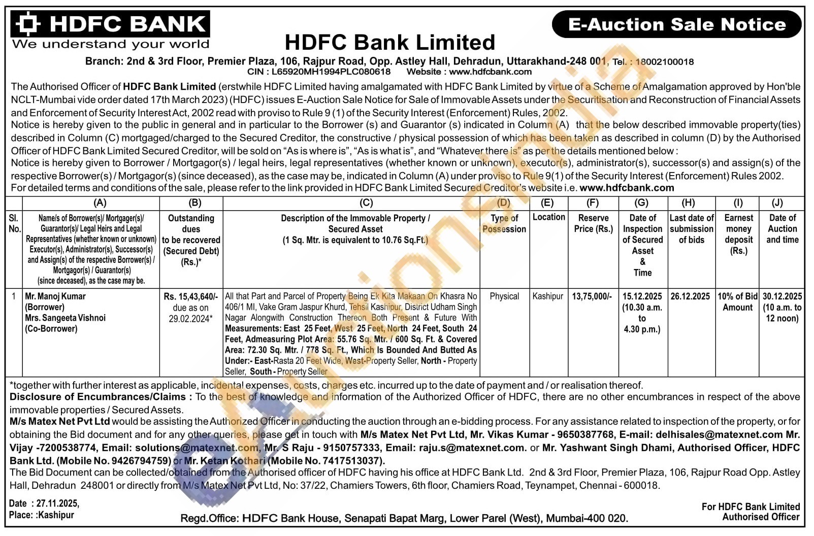 All that Part and Parcel of Property Being Ek Kita Makaan On Khasra No 406/1 MI, Vake Gram Jaspur Khurd, Tehsil Kashipur, District Udham Singh Nagar Alongwith Construction Thereon Both Present & Future With Measurements: East 25 Feet, West 25 Feet, North 24 Feet, South 24 Feet, Admeasuring Plot Area: 55.76 Sq. Mtr./600 Sq. Ft. & Covered Area: 72.30 Sq. Mtr. /778 Sq. Ft., Which Is Bounded And Butted As Under:-East-Rasta 20 Feet Wide, West-Property Seller, North - Property Seller, South-Property Seller