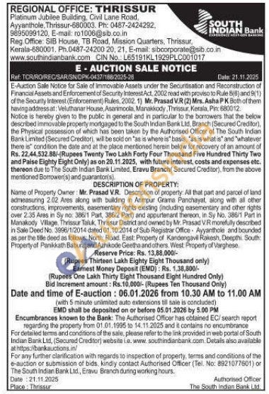 All that part and parcel of land admeasuring 2.02 Ares along with building in Animpur Grama Panchayat, along with all other constructions, improvements, easementary rights existing (including easementary and other rights over 2.35 Aras in Sy no: 386/1 Part, 386/2 Part) and appurtenant thereon, in Sy No. 388/1 Part in Manakody Village, Thrissur Taluk, Thrissur District and owned by Mr. Prasad VR morefully described in Sale Deed No. 3996/1/2014 daled 01.10.2014 of Sub Registrar Office Ayyanthole and bounded as per the title deed as follows: North Road East: Property of Kandengavil Rakesh, Deegithi South: Property of Pansikkath Baburaj and Azhikode Geetha and others. West: Property of Varghese