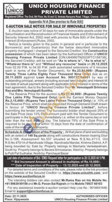 Schedule-A:Description of the Property: All that piece of land and building with an extent of 148 Sq.yards along with constructions therein bearing Door No.3-188, Assessment No.557 situated at New R.S.No.471/3, Old R.S.No. 470/1A of Nandivada Village, Nandivada Mandal, Krishna District, A.P being bounded by: East by: Property belongs to Macharia Venkataratnam, South by: Property belongs to Bevara Srinivasarao, West by: Property belongs to Putti Pal Sudhakar, North by: Panchayat Bazar