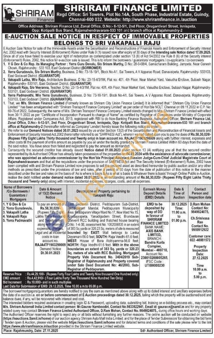 East Godavari District. Peddapuram Sub-District, Peddapuram Mandal, Peddapuram Municipality Area. Peddapuram Village Ward No. 17, New Ward No. 15, Kondayyapeta, Yanadigudem Street, Brundavan Convent RCC building and thatched house bearing D.No. 1-4-3B, assessment No, 1062006835 in an extent of 383 Sq yards or 320.23 Sq. meters of site is measured bounded by: EAST: Wall belongs to Lanka Dayamani-56.0 feet, SOUTH: Raja Veedhi-61.6 feet; WEST: House of Bora Atchiyamma-56.0 feet: NORTH: Raja Veedhi-51.6 feet. With in the above boundaries an extent of 383 Sq. yards or 320.23 Sq. meters of site with RCC Building. Mortgaged Property Vide Document No. 3404/2019 Sub-Registrar of Rajahmundry and Property covered under Sale Deed Document No: 46/2003, Sub-Registrar of Peddapuram.