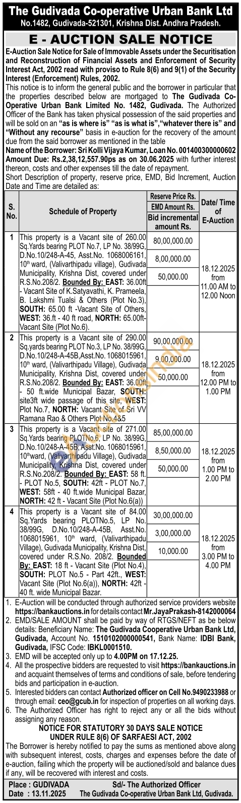 This property is a Vacant site of 260.00 Sq. Yards bearing PLOT No.7, LP No. 38/99G, D.No.10/248-A-45, Asst. No. 1068006161, 10th ward, (Valivarthipadu village), Gudivada Municipality, Krishna Dist, covered under R.S.No.208/2. Bounded By: EAST: 36.00ft - Vacant Site of K.Satyavathi, K. Prameela, B. Lakshmi Tualsi & Others (Plot No.3), SOUTH: 65.00 ft-Vacant Site of Others, WEST: 36.ft-40 ft road, NORTH: 65.00ft-Vacant Site (Plot No.6).