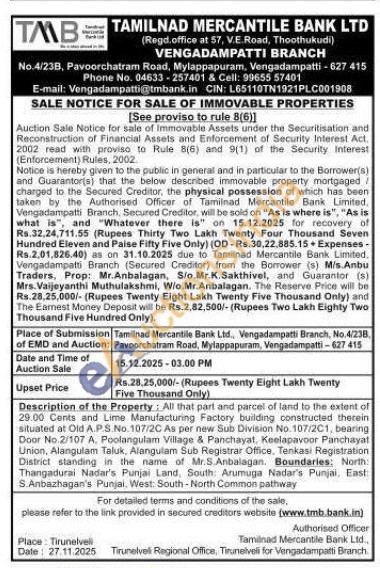Description of the Property: All that part and parcel of land to the extent of 29.00 Cents and Lime Manufacturing Factory building constructed therein situated at Old A.P.S.No. 107/2C As per new Sub Division No. 107/2C1, bearing Door No.2/107 A. Poolangulam Village & Panchayat, Keelapavoor Panchayat Union, Alangulam Taluk, Alangulam Sub Registrar Office, Tenkasi Registration District standing in the name of Mr.S. Anbalagan, Boundaries: North: Thangadurai Nadar's Punjai Land, South Arumuga Nadar's Punjai, East S. Anbazhagan's Punjai, West: South-North Common pathway