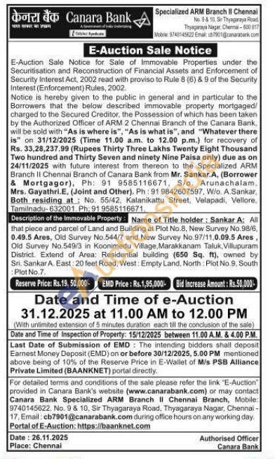 All that piece and parcel of Land and Building at Plot No.8, New Survey No.98/6, 0.49.5 Ares, Old Survey No.544/7 and New Survey No.97/11,0.09.5 Ares, Old Survey No.549/3 in Koonimedu Village, Marakkanam Taluk, Villupuram District. Extend of Area: Residential building (650 Sq. ft), owned by Sri. Sankar A. East: 20 feet Road, West Empty Land, North: Plot No.9, South Plot No. 7.