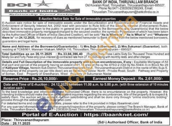 Details and Full Description of the immovable property with known encumbrances, if any: Equitable Mortgage of All that part and parcel of the property having an extent of 01.18 ares at Re-sy No 475/2-2 (Old Sy No.504/4-3) in Block No 28 of Kalliyoor Village, Nemom Sub District, Thiruvananthapuram Taluk, Thiruvananthapuram District in the name of Mrs Suja.S Boundaries of the property (as per title deed) are as mentioned below: North Private Road, South Pathway and Property of Soman, East Property of Sreedharan, West Property of Sukumaran Nadar