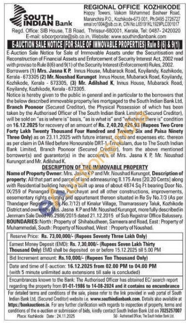 All that part and parcel of land admeasuring 8.175 Ares (20.20 Cents) along with Residential building having a built up area of about 4874 Sq Ft bearing Door No. IX/259 of Panangad Grama Panchayat and all other constructions, improvements, easementary rights existing and appurtenant thereon situated in Re Sy No.7/3 (As per Thandaper Register Re Sy No.7/12) of Kinalur Village, Thamarassery Taluk, Kozhikode District and owned by Mrs. Jasna KPand Mr. Noushad Kurungot, more fully described in Jerman Sale Deed No.2986/2015 dated 21.12.2015 of Sub Registrar Office Balussery. BOUNDARIES: North: Property of Shihabudheen, Sameera and Road, East: Property of Muhammedali, South: Property of Noushad, West: Property of Noushad.