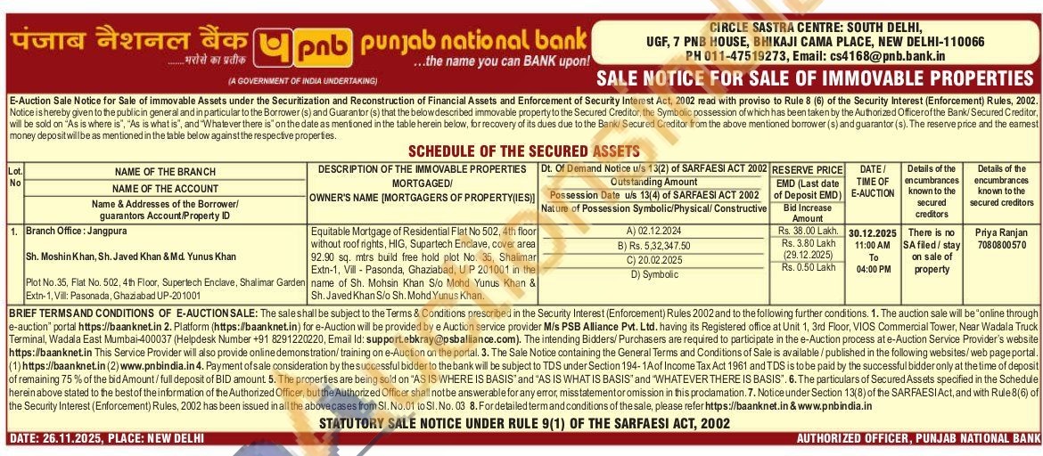 Equitable Mortgage of Residential Flat No 502, 4th floor without roof rights, HIG, Supartech Enclave, cover area 92.90 sq. mtrs build free hold plot No. 35, Shalimar Extn-1, Vill-Pasonda, Ghaziabad, U P 201001 in the name of Sh. Mohsin Khan S/o Mohd Yunus Khan & Sh. Javed Khan S/o Sh. Mohd Yunus Khan.