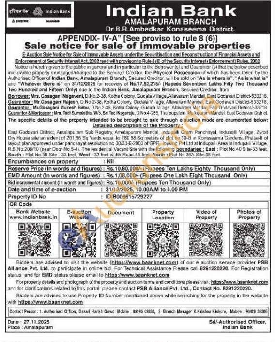 East Godavari District, Amalapuram Sub Registry, Amalapuram Mandal, Indupalli Gram Panchayat, Indupalli Village, Zyroit Diy House site an extent of 201.66 Sq Yards equal to 169.68 Sq meters of plat no.39-8 in Konaseema Gardens, Phase-ll of layout plan approved under panchayat resolution no. 30/33-9-2003 of GPR Housing Pvt Ltd at Indupalli Area in Indupalli Village R.S. No.208/10 (near Door No.5-4). The residential Vacant Site with the following boundaries: East: Plot No 40 Site-33 feetSouth: Plot No 38 Site-33 feet, West: 33 feet width Road-55 feet, North: Plot No 39A Site-35 feet