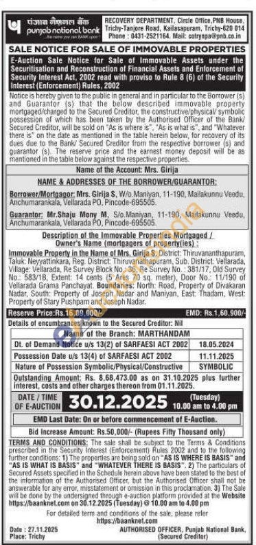 Immovable Property in the Name of Mrs. Girija S. District: Thiruvananthapuram, Taluk: Neyyattinkara, Reg. District. Thiruvanathapuram, Sub. District: Vellarada, Village: Vellarada, Re Survey Block No.: 36, Re Survey No. 381/17, Old Survey No.: 583/1B, Extent: 14 cents (5 Ares 70 sq. meter), Door No. 11/190 of Vellarada Grama Panchayat. Boundaries: North: Road, Property of Divakaran Nadar, South: Property of Joseph Nadar and Maniyan, East: Thadam, West: Property of Stary Pushpam and Joseph Nadar.