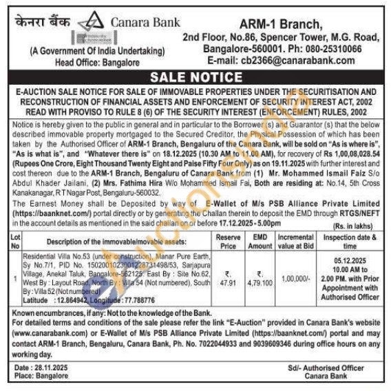 Residential Villa No.53 (under construction), Manar Pure Earth, Sy No.7/1, PID No. 1502001023001228731498/53, Sarjapura Village, Anekal Taluk, Bangalore-562125. East By: Site No. 62, West By: Layout Road, North By: Villa 54 (Not numbered), South By: Villa 52 (Not numbered