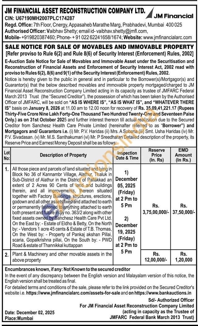 All those piece and parcels of land situated and lying in Block No 36 of Kannambr Village, Alathur, Thaluk in Sub-District of Alathur in the District of Pallakkad an extent of 2 Acres 90 Cents of land and buildings therein, and all improvements, thereon situated together with Factory Buildings, structures, erections. godown and all other assets fixed and attached to earth or permanently fastened to anything attached to earth both present and future in Sy no. 363/2 along with other fixed assets owned by Sanchesz Health Care Pvt Ltd. On the East by: - Estate of Eldho & Betty, On the North by: - Vendors 1 acre 45 cents & Estate of T.B. Thomas, On the West by: Property of Pankaj akshan Pillai, scaria, Gopalkrishna pillai, On the South by: - PWD Road & estate of Thannikkal kuttappan