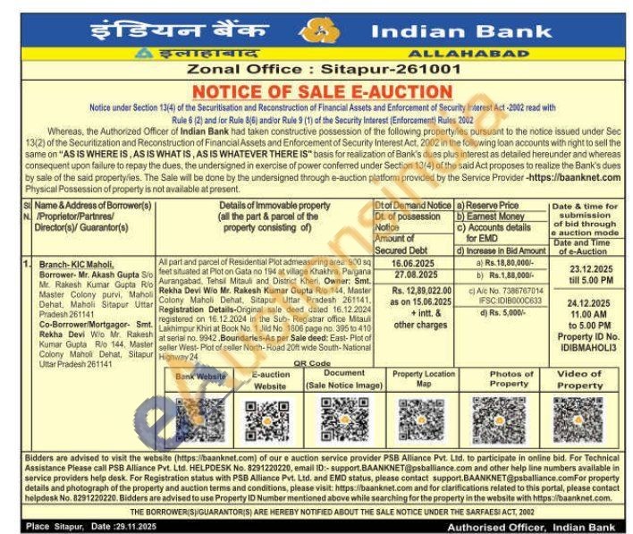 All part and parcel of Residential Plot admeasuring área: 900 sq feet situated at Plot on Gata no 194 at village Khakhra, Pargana Aurangabad. Tehsil Mitauli and District Kheri, Owner: Smt. Rekha Devi Wio Mr. Rakesh Kumar Gupta Rio 144, Master Colony Maholi Dehat. Sitapur Uttar Pradesh 261141. Registration Details-Original sale deed dated 16.12.2024 registered on 16.12.2024 in the Sub- Registrar office Mitauli Lakhimpur Khin at at Book No. No. 1 Jild No. 1606 page no. 395 to 410 at serial no. 9942, Boundaries-As per Sale deed: East-Plot of selier West-Plot of seller North-Road 20ft wide South-National Highway 24