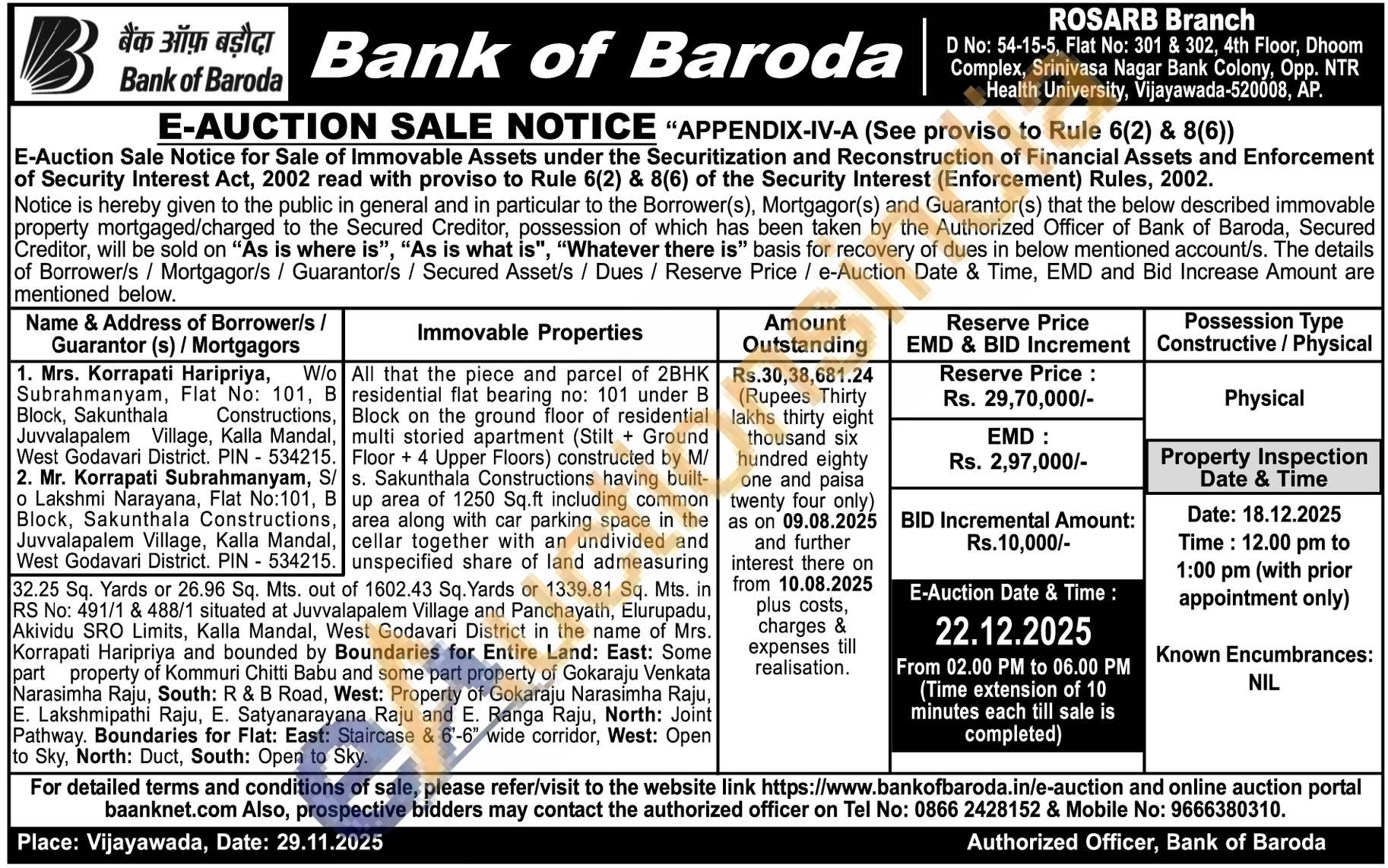 All that the piece and parcel of 2BHK residential flat bearing no: 101 under B Block on the ground floor of residential multi storied apartment (Stilt + Ground Floor + 4 Upper Floors) constructed by M/S. Sakunthala Constructions having built-up area of 1250 Sq.ft including common area along with car parking space in thecellar together with an undivided and . unspecified share of land admeasuring 32.25 Sq. Yards or 26.96 Sq. Mts. out of 1602.43 Sq. Yards or 1339.81 Sq. Mts. in RS No: 491/1 & 488/1 situated at Juvvalapalem Village and Panchayath, Elurupadu, Akividu SRO Limits, Kalla Mandal, West Godavari District in the name of Mrs. Korrapati Haripriya and bounded by Boundaries for Entire Land: East: Some part property of Kommuri Chitti Babu and some part property of Gokaraju Venkata Narasimha Raju, South: R & B Road, West: Property of Gokaraju Narasimha Raju, E. Lakshmipathi Raju, E. Satyanarayana Raju and E. Ranga Raju, North: Joint Pathway. Boundaries for Flat: East: Staircase & 6'-6" wide corridor, West: Open to Sky, North: Duct, South: Open to Sky.