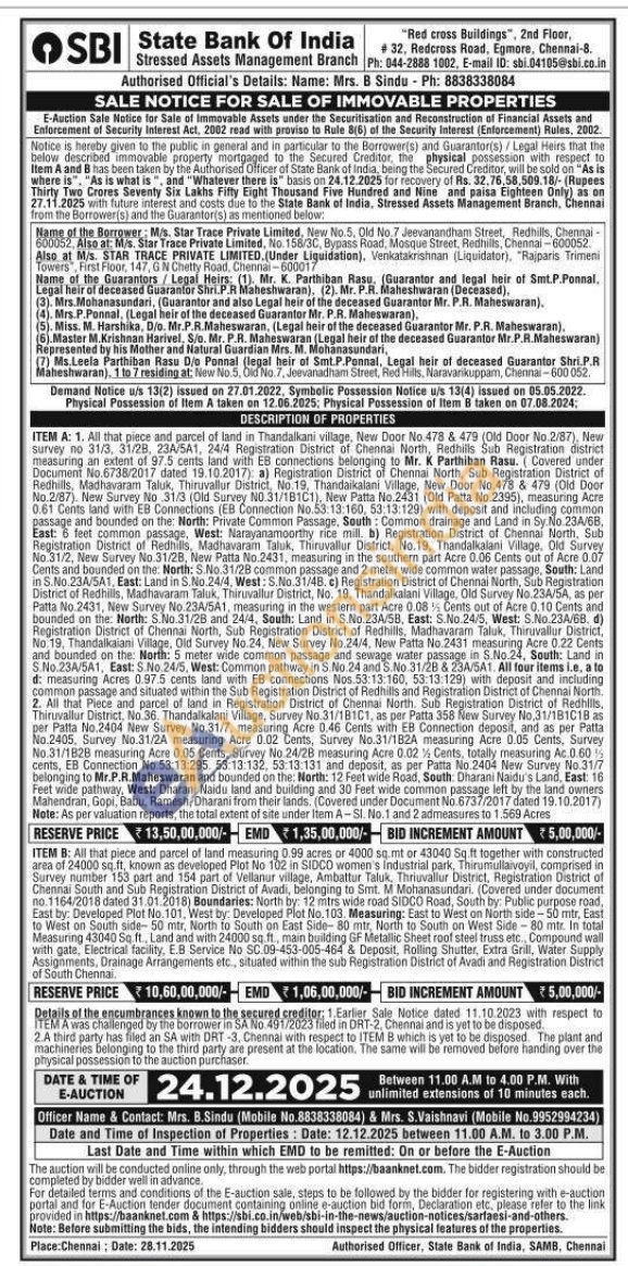ITEM A: 1. All that piece and parcel of land in Thandalkani village, New Door No.478 & 479 (Old Door No 2/87), New survey no 31/3, 31/28, 23A/5A1, 24/4 Registration District of Chennai North, Redhills Sub Registration district measuring an extent of 97.5 cents land with EB connections belonging to Mr. K Parthiban Rasu. (Covered under Document No.6738/2017 dated 19.10.2017): a) Registration District of Chennai North, Sub Registration District of Redhills, Madhavaram Taluk, Thiruvallur District, No. 19, Thandaikalani Village, New Door No.478 & 479 (Old Door No.2/87). New Survey No 31/3 (Old Survey N0.31/181C1), New Patta No.2431 (Old Patta No.2395), measuring Acre 0.61 Cents land with EB Connections (EB Connection No.53:13:160, 53:13:129) with deposit and including common passage and bounded on the: North: Private Common Passage, South: Common drainage and Land in Sy No.234/68, East: 6 feet common passage, West: Narayanamoorthy rice mill. b) Registration District of Chennai North, Sub Registration District of Redhills, Madhavaram Taluk, Thiruvallur District, No.19, Thandalkalani Village, Old Survey No.31/2, New Survey No.31/2B, New Patta No.2431, measuring in the southern part Acre 0.06 Cents out of Acre 0.07 Cents and bounded on the North: S.No.31/28 common passage and 2 meter wide common water passage, South: Land in S.No.23A/5A1, East: Land in S.No.24/4, West: S.No.31/48. c) Registration District of Chennai North, Sub Registration District of Redhills, Madhavaram Taluk, Thiruvallur District, No. 19, Thandalkalani Village, Old Survey No.23A/5A, as per Patta No.2431, New Survey No.23A/5A1, measuring