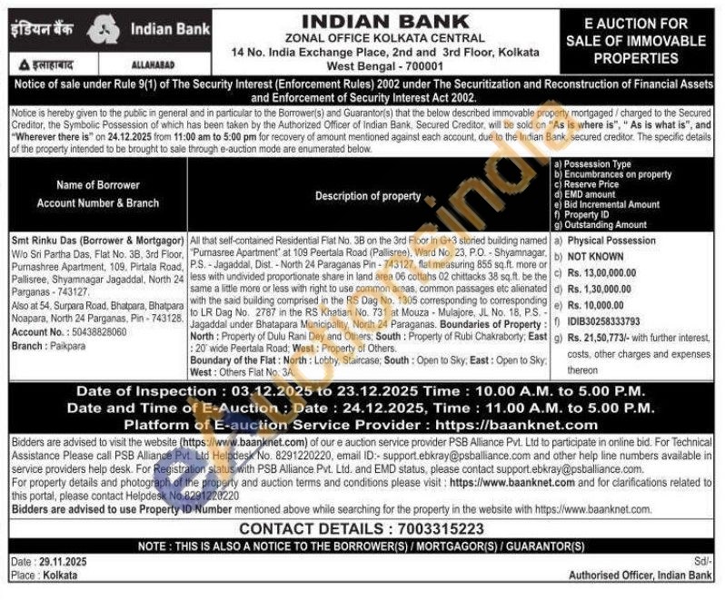 All that self-contained Residential Flat No. 3B on the 3rd Floor in G+3 storied building named "Pumasree Apartment" at 109 Peertala Road (Pallisree), Ward No. 23, P.O. Shyamnagar. P.S.-Jagaddal, Dist. - North 24 Paraganas Pin-743127, flat measuring 855 sq.ft. more or less with undivided proportionate share in land area 06 cottahs 02 chittacks 38 sq.ft. be the same a little more or less with right to use common areas, common passages etc alienated with the said building comprised in the RS Dag No. 1305 corresponding to corresponding to LR Dag No. 2787 in the RS Khatian No. 731 at Mouza Mulajore, JL. No. 18, P.S-Jagaddal under Bhatapara Municipality, North 24 Paraganas. Boundaries of Property: North: Property of Dulu Rani Dey and Others: South: Property of Rubi Chakraborty, East :20' wide Peertala Road: West: Property of Others.