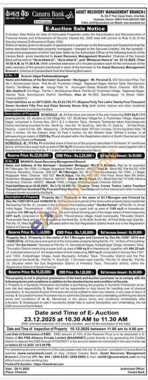 (Property in the name of Sri.T.Murugan and Covered by Doc.No. 14387/2014 and 14388/2014). All that piece and parcel of the immovable property being flat No. F2, 1st floor of the building called "Sri Sai Homes" Situated at Plot No 14, Secretariat Nagar, Kolpathagai Village, Ambattur Taluk Thiruvallur District measuring a super built up area of 950 sq.ft or thereabouts, together with 484.25 sqft of undivided share out of the larger extent of land measuring 1937 sq. ft, comprised in Survey Nos 136/1 and 136/2, Kolpathagai Village, Avadi Mucipality, Ambatur Taluk. Thiruvallur District and the Plot bounded on the North By Plot No 11, South By: 7.20 meter road, East By: Plot No 13. West By: Plot No 15 Situsted within the Sub Registration District of Ambattur Taluk, Thiruvallur district, within the Registration District of South Chennai