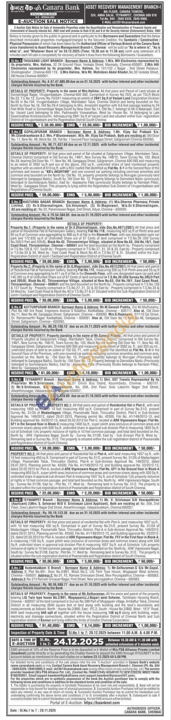 1)All that piece and Parcel of Land situate at Sornambigal Nagar, Virugambakkam, Chennal-600 092, Comprised in Survey No.70/2, as per TSLR Block No.23. TS No. 12. Survey No. 70/2A1 measuring an extent of 2841 Sq.ft of Vacant Land Corporation Division No.65 in No.104, Virugambakkam Village, Mambalam Taluk, Chennai District and being bounded on the North by Door No. 16, Old No 29-A belonging to Mrs. Amarjothi together with 9.6 feet passage leading to 24 Feet Wide Road in Sornambigai Nagar South by:New Door No.14, Old No. 7, belongs to Mr.S. Matarajan, East by: Vacant Land belonging to Mrs. Padmavathi Viswanathan, West by House No. 14 belonging to Late Swaminathan Krishnamoorthi. Admeasuring 2841 Sqft of Vacant Land and situated within Sub-registration District of Virugambakkam and the Registration District South Chennal