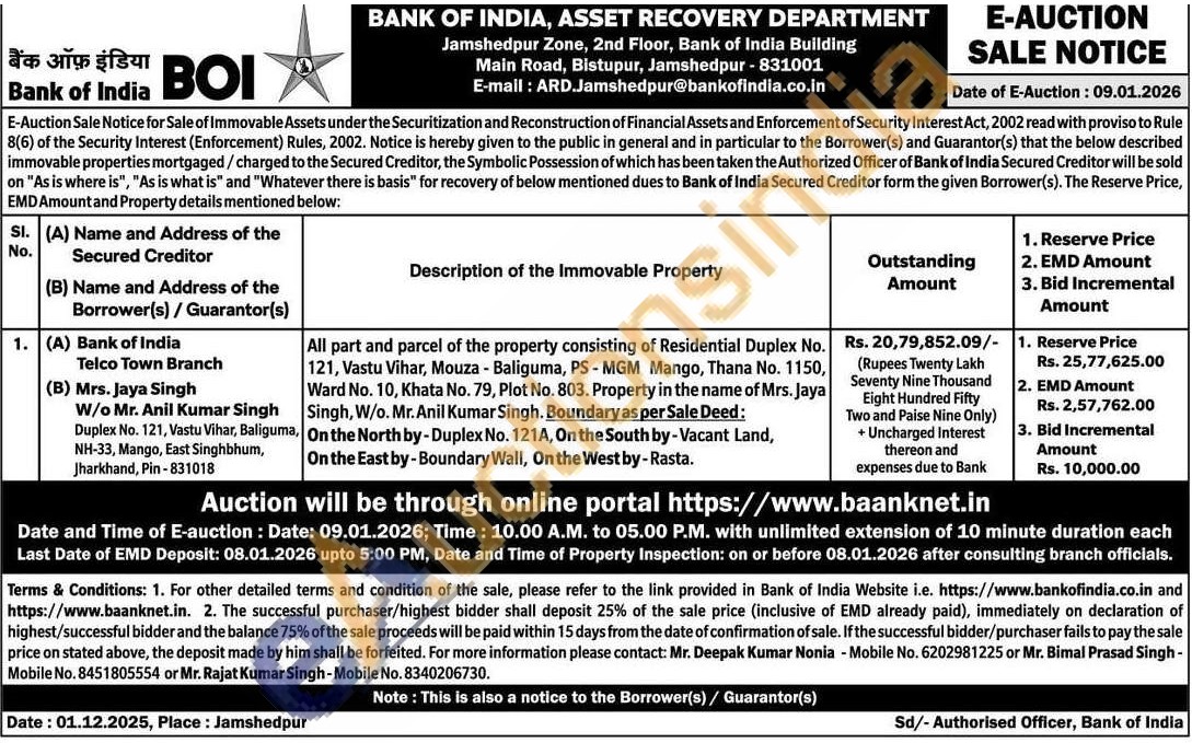 All part and parcel of the property consisting of Residential Duplex No. 121, Vastu Vihar, Mouza - Baliguma, PS-MGM Mango, Thana No. 1150, Ward No. 10, Khata No. 79, Plot No. 803. Property in the name of Mrs. Jaya Singh, W/o. Mr. Anil Kumar Singh. Boundary as per Sale Deed: On the North by-Duplex No. 121A, On the South by-Vacant Land, On the East by-Boundary Wall, On the West by-Rasta.