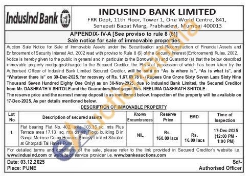 Flat bearing Flat No. 402, area 103.35 sq. mis Plus Terrace area 17.13 sq. mis on 4th Floor, building Bin Ganga Melrose Co-op Housing Society Limited Situated at Ghorpadi Tal Haveli Pune.