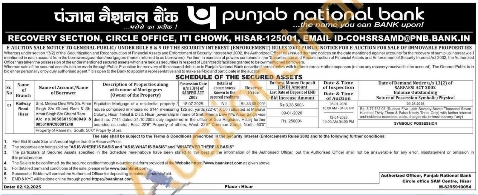 Residential Property of house comprised in khasra no 6144 measuring 125 sq. yards (22-6" X 50') situated at Mahavir Colony, Hisar, Tehsil & Distt. Hisar [ownership in name of Smt. Meena Devi Wio Amar Singh vide no.00586015000049 & deed no. 7744 dated 31.10.2005 duly registered in the office of Sub Registrar, Hisar) further bounded as under: East: 228" Property of others, West: 22'6" Common Street, North: 500" Rs