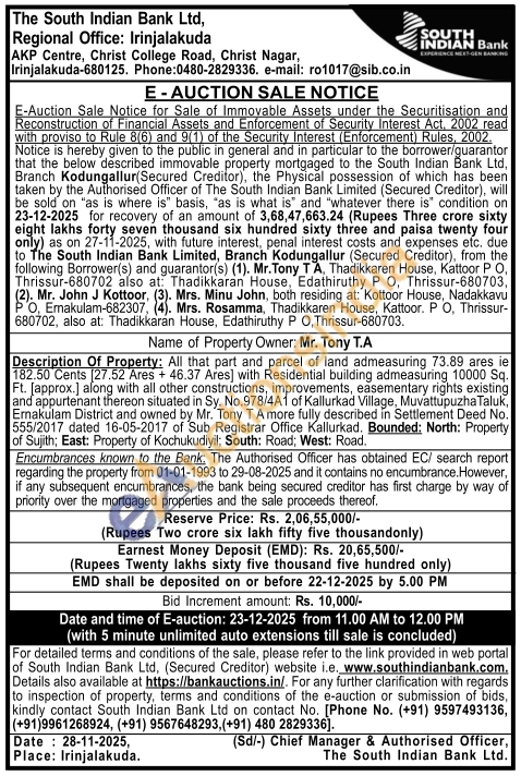 Description Of Property: All that part and parcel of land admeasuring 73.89 ares ie 182.50 Cents 27.52 Ares + 46.37 Ares] with Residential building admeasuring 10000 Sq. Ft. [approx.] along with all other constructions, improvements, easementary rights existing and appurtenant thereon situated in Sy. No.978/4A1 of Kallurkad Village, Muvattupuzha Taluk, Ernakulam District and owned by Mr. Tony T A more fully described in Settlement Deed No. 555/2017 dated 16-05-2017 of Sub Registrar Office Kallurkad, Bounded: North: Property of Sujith; East: Property of Kochukudiyil; South: Road; West: Road